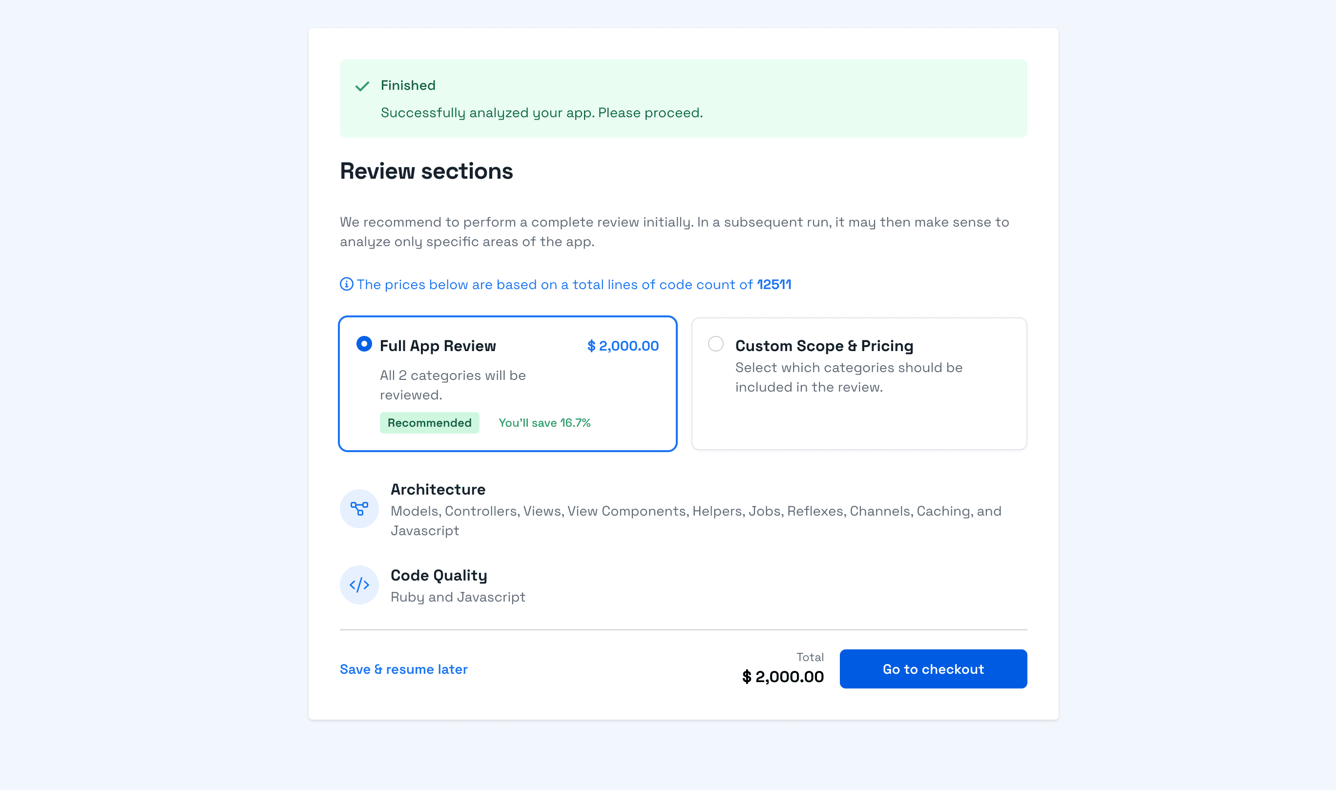 - Create a review. This will automatically compute your app's LOC (lines of code) statistics and calculate a price.
