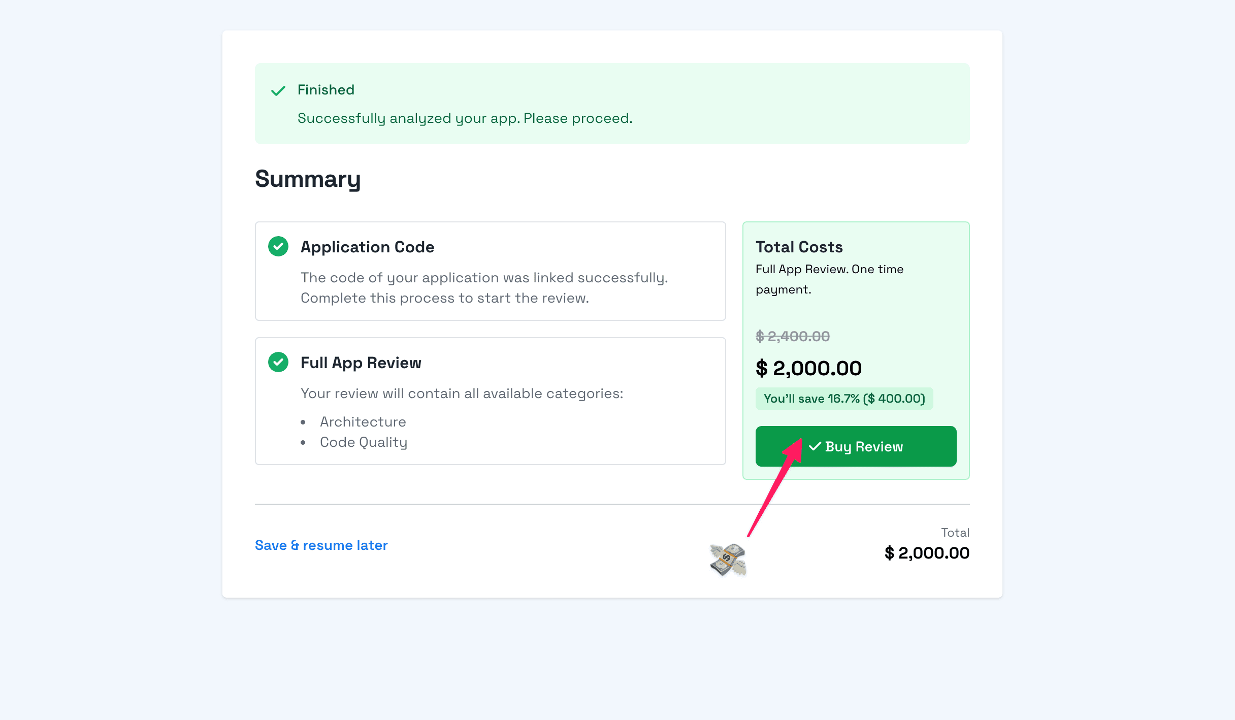 - That's it! Your app will now be automatically processed to prepare the manual part of the review. Once your review is done, you will get a notification in your preferred format.